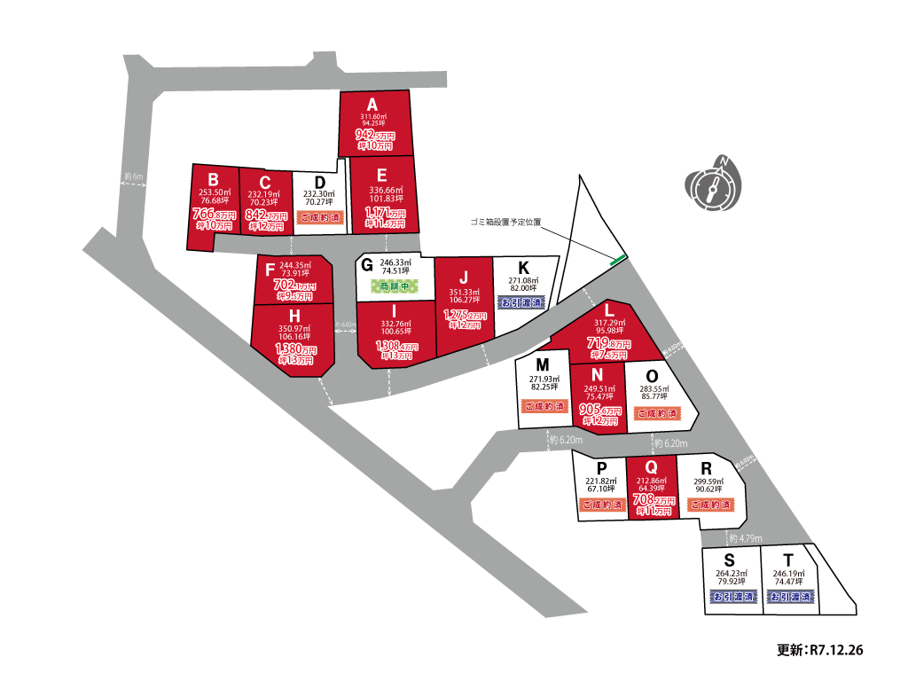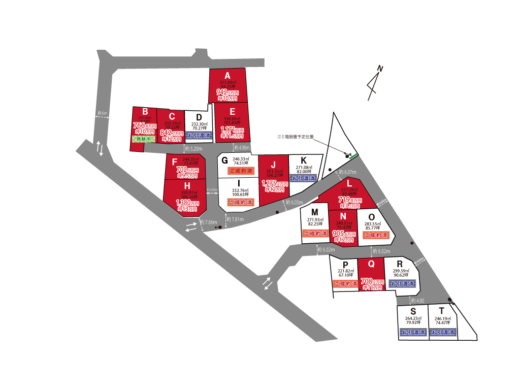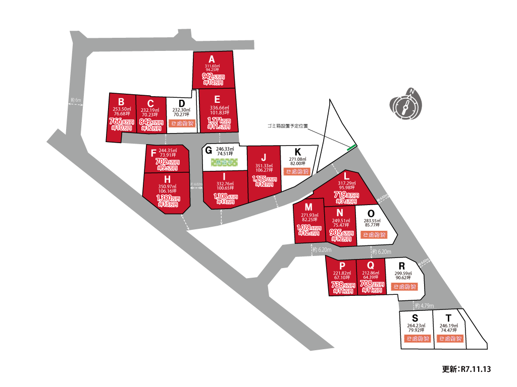 | 土地面積 | 計画面積:213.05m2 (64.44坪) ~ 351.31m2 (106.27坪) |